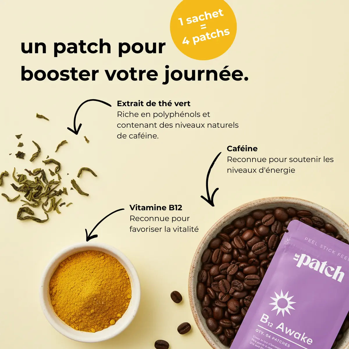 Patch révolutionnaire qui libère caféine et B12 progressivement. Énergie propre sans crash pour performer du matin au soir naturellement.